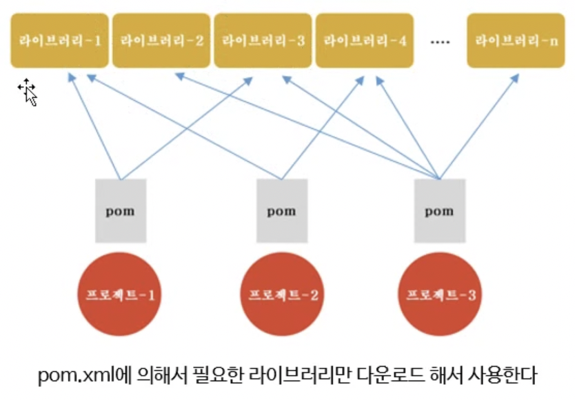 그리고 메이븐은 라이브러리(모듈,기능 이라고 생각)를 연결해주고 빌드를 수행한다...